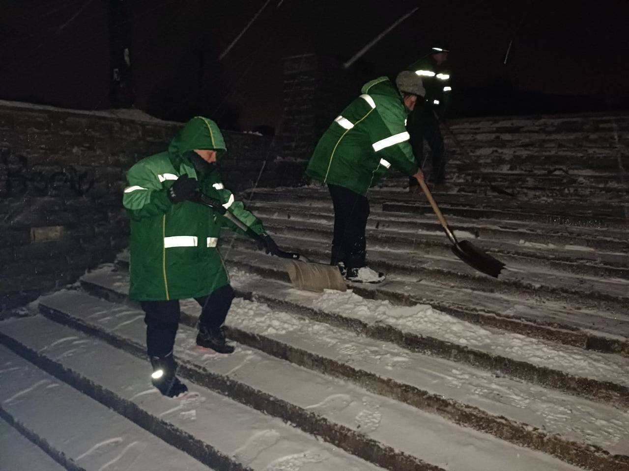 429 працівників у складі 71 бригади з ручного прибирання очищають від снігу та обробляють протиожеледними засобами зупинки, вузькі тротуари, сходи, острівці безпеки, пішохідні переходи.
