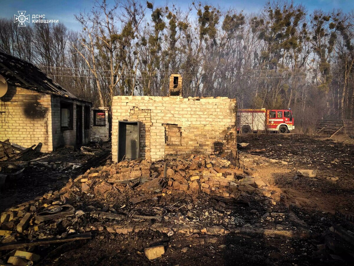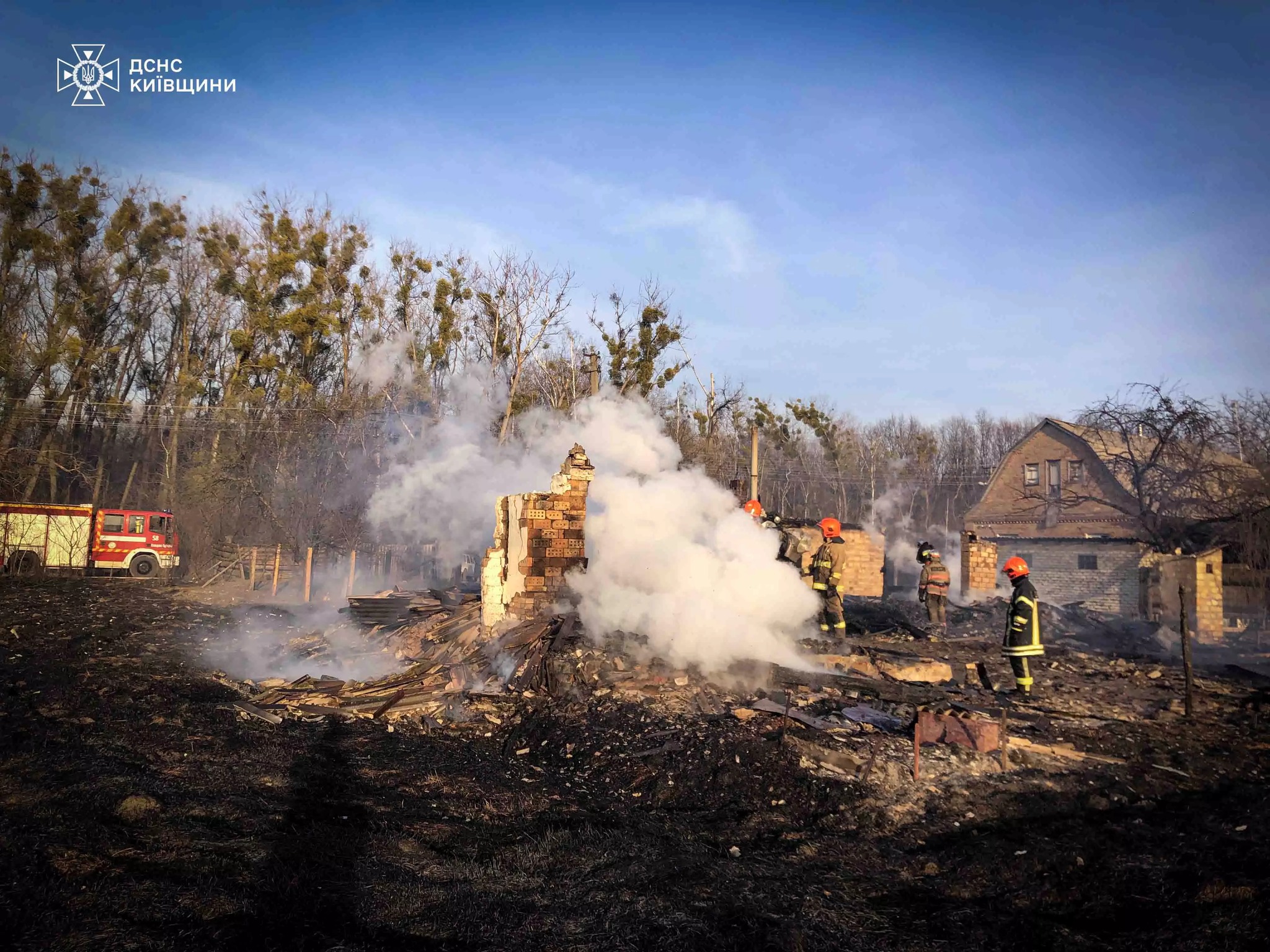 У ДСНС Київщини повідомили, що вогнем було охоплено три житлові будинки, три господарчі будівлі та 1,5 гектара трав'яного настилу.