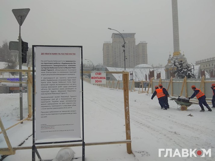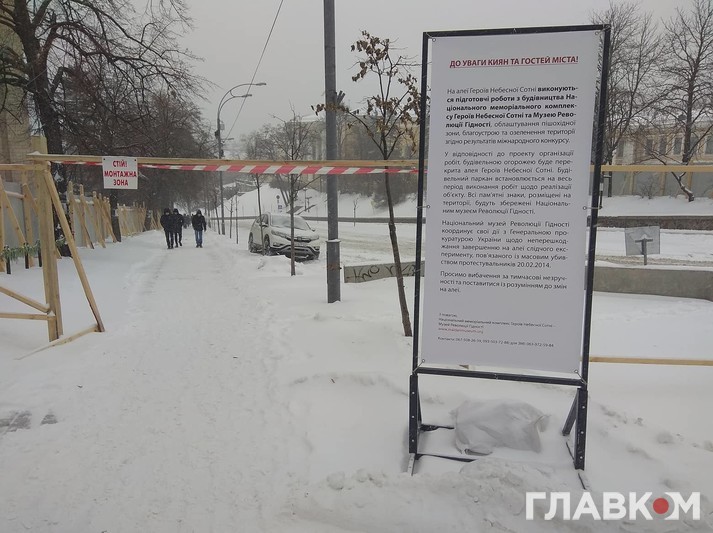 Заступник генерального директора з будівництва Національного музею Революції Гідності Оксана Моргун повідомила: «Будівельним парканом буде перекрито алею Героїв Небесної сотні таким чином, щоб забезпечити безперешкодний доступ до готелю «Україна» з Хрещатика. Територію, на якій розміщуються капличка та хрест, огороджуватимуть після повідомлення Генеральної прокуратури про завершення слідчих дій на цій ділянці. Паралельно з установленням будівельного паркану та облаштуванням побутового містечка буде здійснено роботи з КО «Київзеленбуд» стосовно обстеження стану зелених насаджень на території об’єкта, очищення та видалення їх. Виконання зазначених робіт потребуватиме близько двох тижнів».