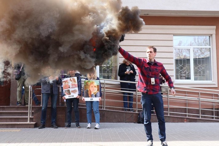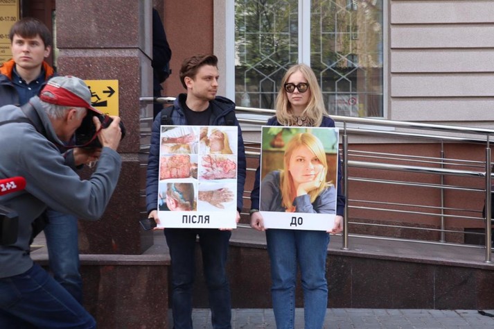 На акцію вони принесли великі фото Гандзюк, на яких вона зображена із травмами, отриманими внаслідок замаху. Також активісти запалили фаєри та петарди, які досить гучно вибухали під входом до будівлі суду.