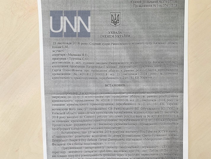Ржищівський міськсуд Київської області за клопотанням прокурора Кагарлицької місцевої прокуратури надав дозвіл на проведення обшуку у помешканні митрополита Павла, а також у Лаврі.