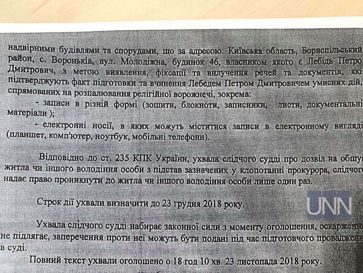 В рамках кримінального провадження правоохоронці проводять слідчі дії, а саме обшуки з метою виявити записи (зошити, блокноти, записники, листи, документи) чи електронні носії інформації з метою виявлення фактів, що підтверджують підготовку митрополитом умисних дій, спрямованих на розпалювання релігійної ворожнечі.