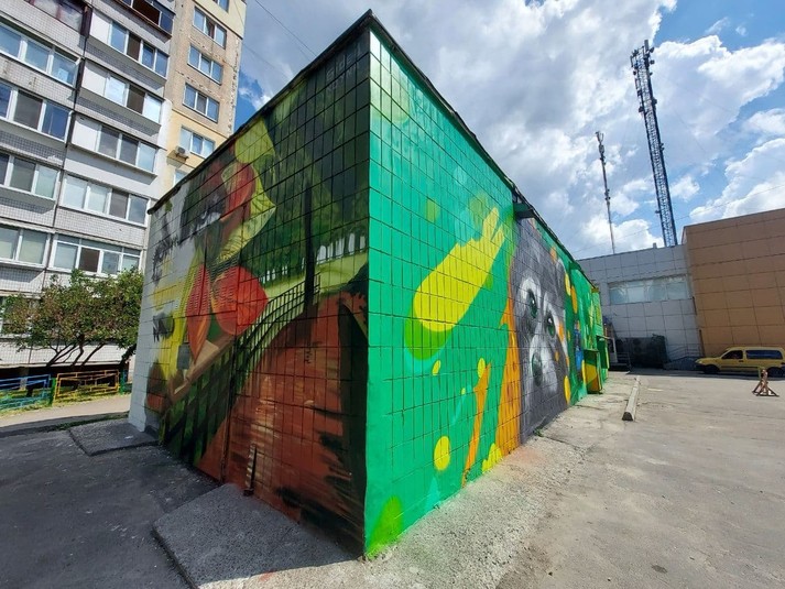 Усі стіни будівлі прикрашають мурали авторства київського художника Віталія Гідевана.