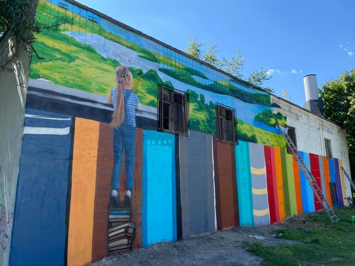 На стіні зображена дівчинка, що стоїть на книжках, і їй відкривається чудовий обрій.
