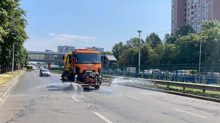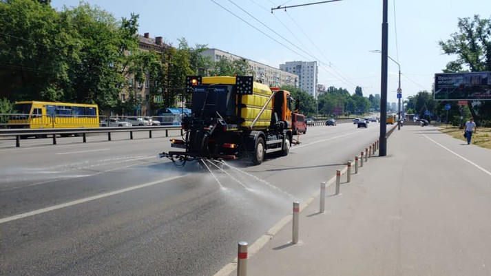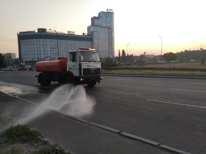 У Києва триває спека. Комунальні підприємства, підпорядковані корпорації «Київавтодор», у посиленому режимі здійснюють полив і миття вулиць, повідомляє корпорація.