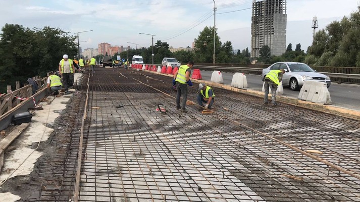 У цілодобовому режимі продовжувалися роботи на шляхопроводі на перетині вулиць Олени Теліги та Кирилівської, де тривають роботи з розбирання перехідної плити, а також влаштування опалубки та арматурного каркасу монолітного тротуарного блоку.