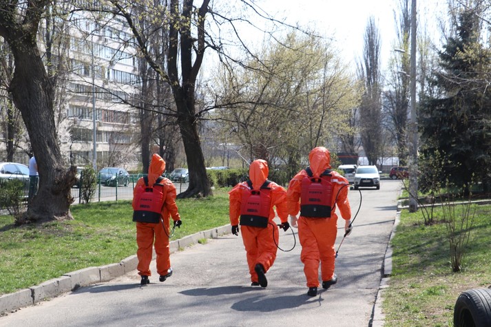Протягом чотирьох днів рятувальники, згідно з наданим переліком від штабу з ліквідації наслідків надзвичайної ситуації Київської міської державної адміністрації, в спеціальних захисних костюмах продезінфікували загалом 46 об'єктів у Голосіївському, Дарницькому, Деснянському, Дніпровському, Печерському, Солом'янському, Святошинському та Шевченківському районах столиці загальною площею близько 15 тис. кв. м.