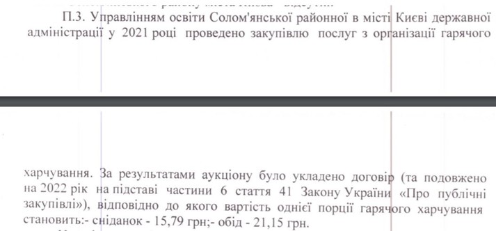 У деяких навчальних закладах Деснянського району шкільні обіди вже подорожчали з цього тижня майже на третину – з 35 до 45 грн. Якою буде остаточна ціна після завершення процедур закупівлі для всіх шкіл також стане зрозуміло за результатами тендерів.