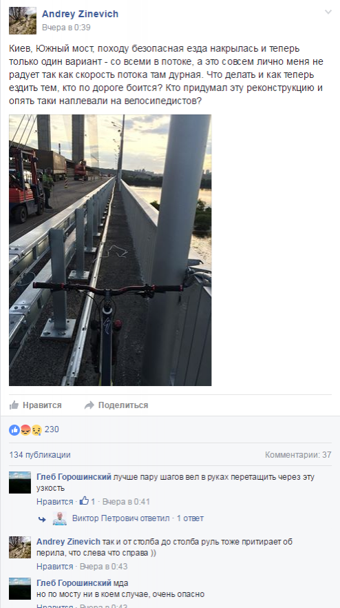 Кияни, які пересуваються містом на двоколісному транспорті, активно висловлюють своє невдоволення наслідками ремонту, адже їздити на велосипеді по Південному мосту в загальному потоці досить небезпечно.