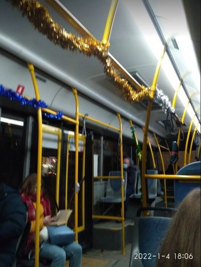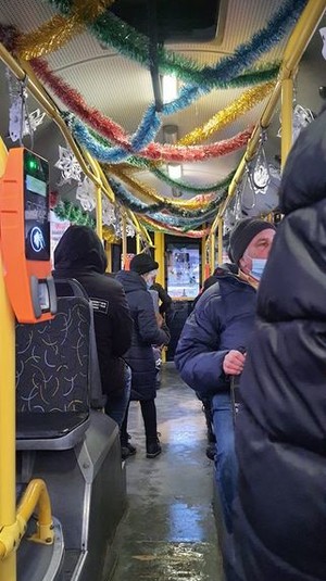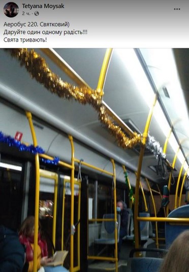 У Києві курсують тролейбуси та автобуси, які своїм інтер’єром підтримують святковий настрій містян та гостей столиці. До прикладу, салон тролейбуса № 38 прикрашений різнобарвними новорічним гірляндами та сніжинками. Відповідні фото з’явилися на сторінці спільноти New Русанівка у Facebook.