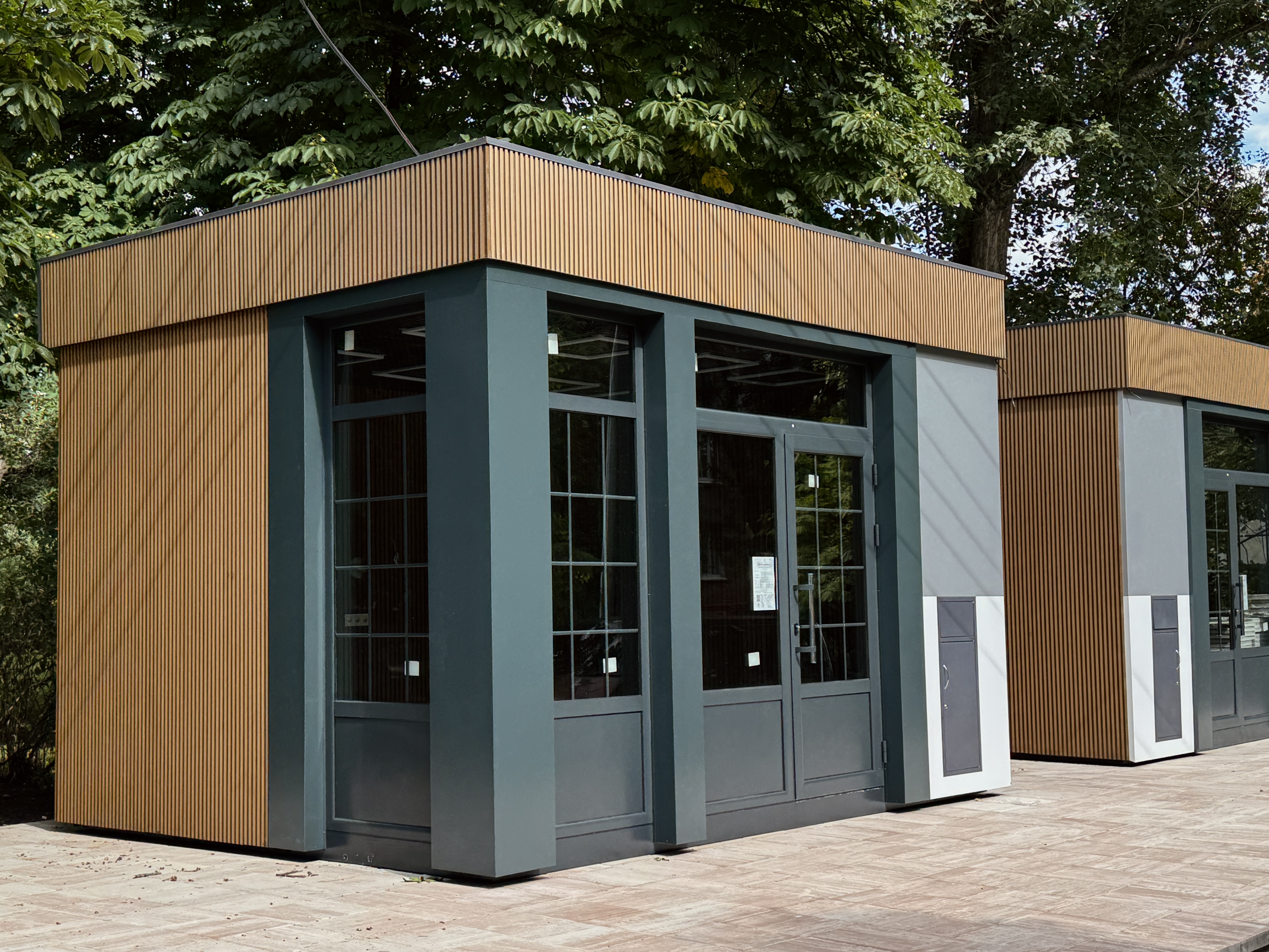 Так, площа торгових павільйонів становить 10–30 кв. м, вендингових автоматів – 1–2 кв. м, поштоматів – 0,5–1,5 кв. м. Фасади мають бути виконані зі світлопрозорих конструкцій із армованого ПВХ або алюмінію, облицьовані композитними панелями. Кольорова палітра – темно-сірий, світло-сірий і нейтральний. Ці стандартизовані технічні характеристики спрощують погодження та встановлення об’єктів на різних локаціях.