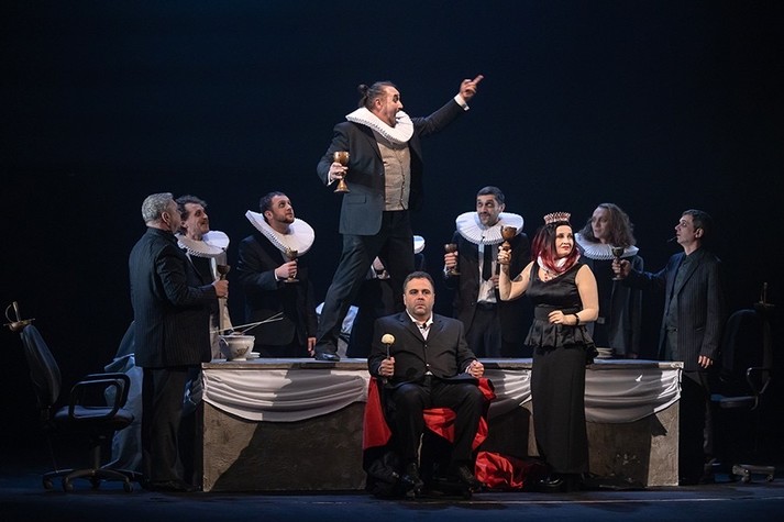 Перша постановка – це переосмислення класичної п’єси за перекладом з англійської Юрія Андруховича. У цій інтригуючій інтерпретації події розгортаються поза часом. Зовнішній вигляд середньовічних героїв та їхній побут тісно переплітається із нинішнім. Цим рішенням режисер Тарас Мазур, художниця-постановниця Анна Духовична і балетмейстер – заслужена артистка України Діана Калакай доводять: теми шекспірівського твору актуальні для будь-якого часу та суспільства.