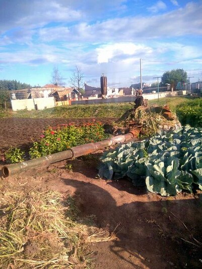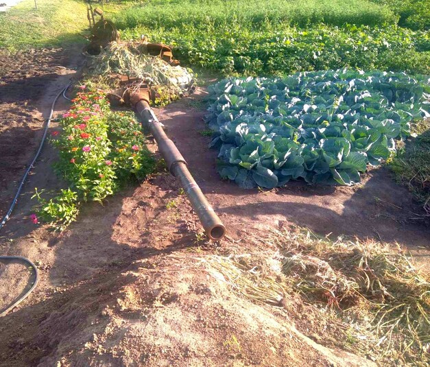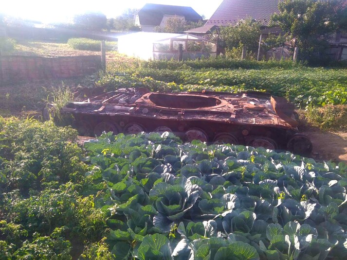 Жителька селища Велика Димерка знайшла на своєму городі спалений ворожий танк, який тепер слугує клумбою, а поряд з танком росте капуста.