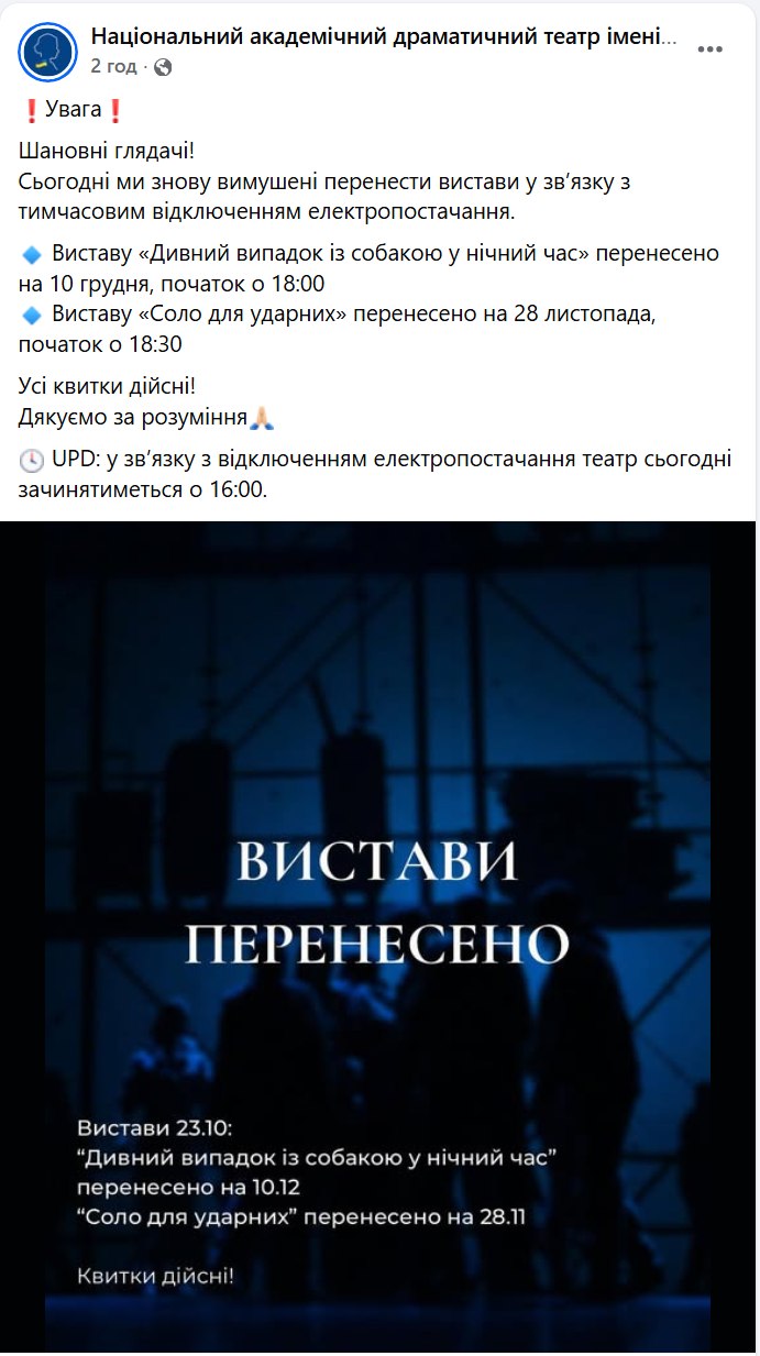 «Ми знову вимушені перенести вистави у звʼязку з тимчасовим відключенням електропостачання. Виставу «Дивний випадок із собакою у нічний час» перенесено на 10 грудня, початок о 18:00. Виставу «Соло для ударних» перенесено на 28 листопада, початок о 18:30. Усі квитки дійсні! Дякуємо за розуміння», – йдеться у повідомленні.