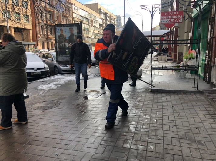 Дорожники уже очищали тротуари на Повітрофлотському проспекті, вулицях Ярославів Вал, Хрещатику, Богдана Хмельницького. Та частина власників закладів знову виставляють нелегальні конструкції на тротуар.