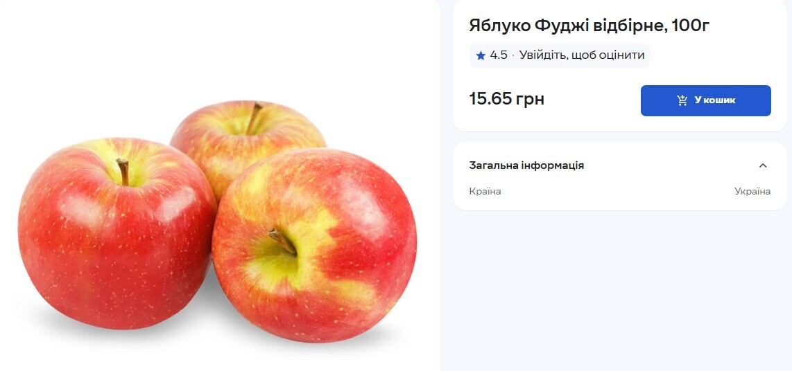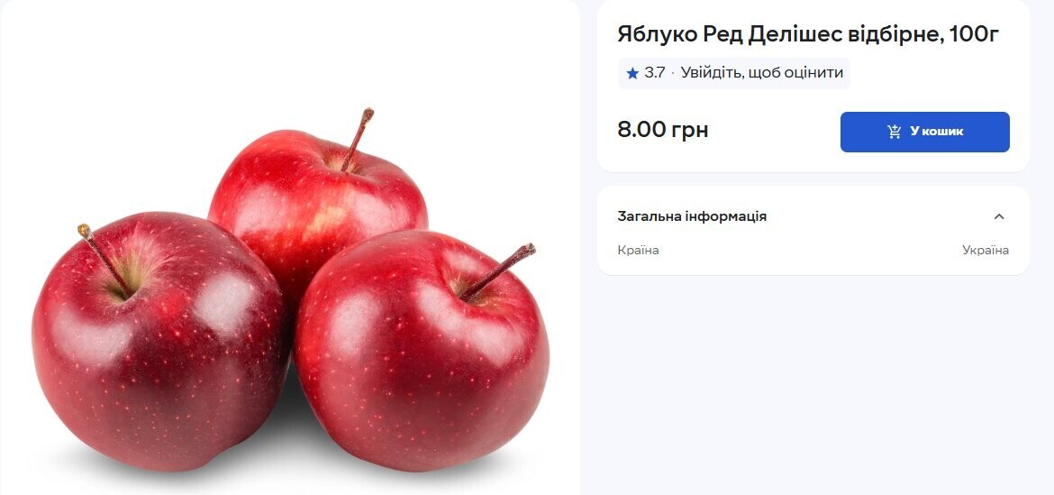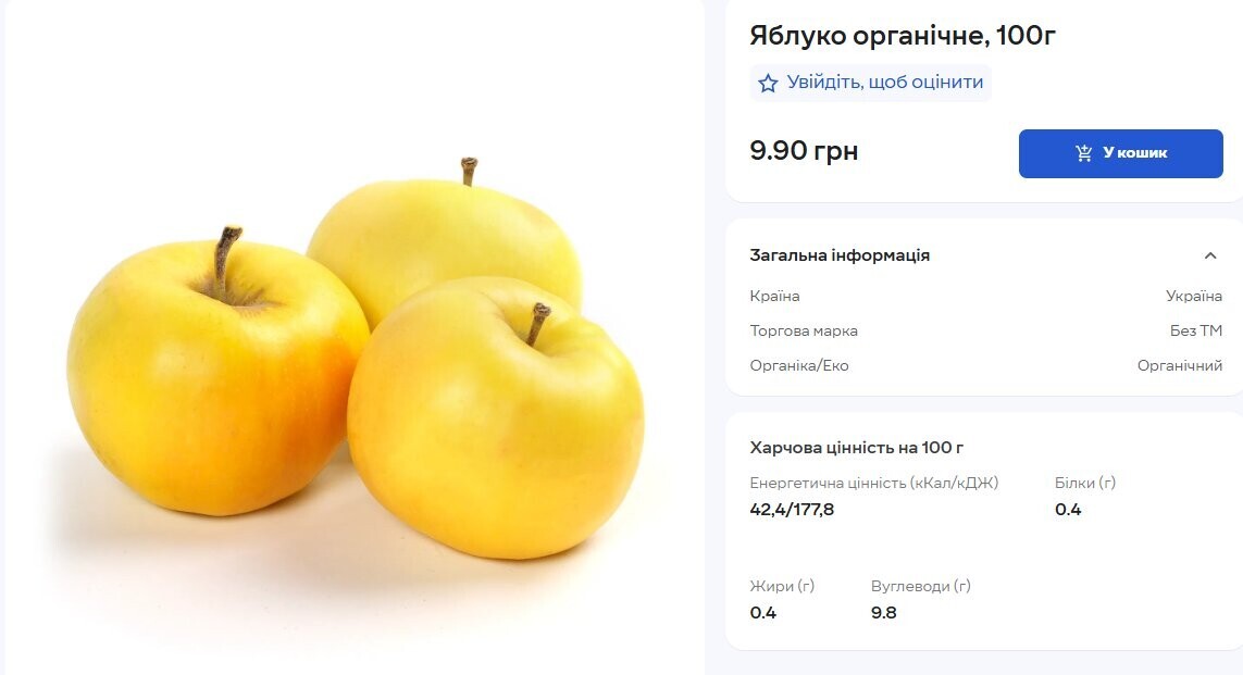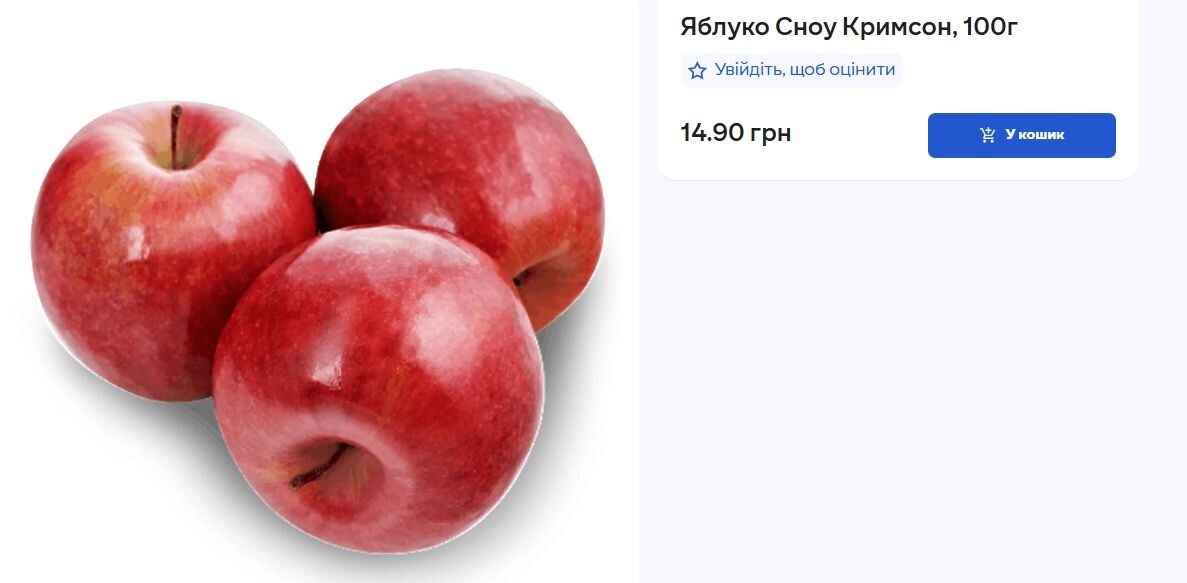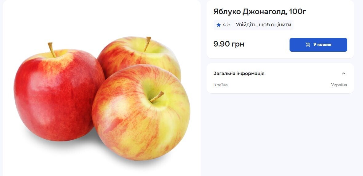 У мережі «Велмарт» яблука сорту «Голден» коштують 89,85 грн за кілограм, а «Айдаред» – 103,04 грн за кілограм.