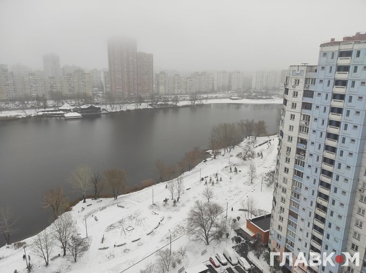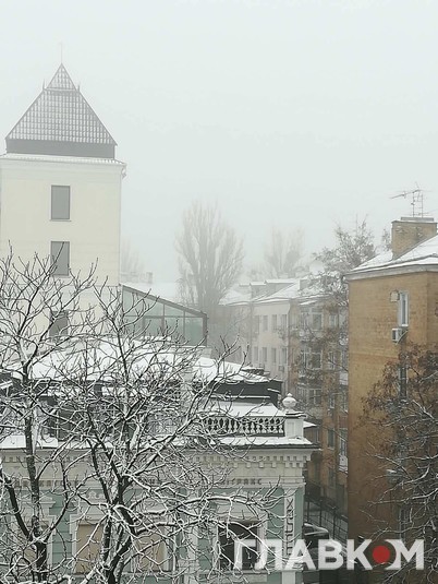 Вранці в понеділок, 6 грудня, на Київ опустився туман. Він огорнув засніжені будинки столиці та дерева на вулицях міста.