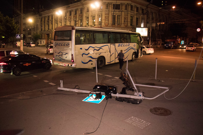 У центрі Києва автобус завалив світлофор і паралізував рух тролейбусів