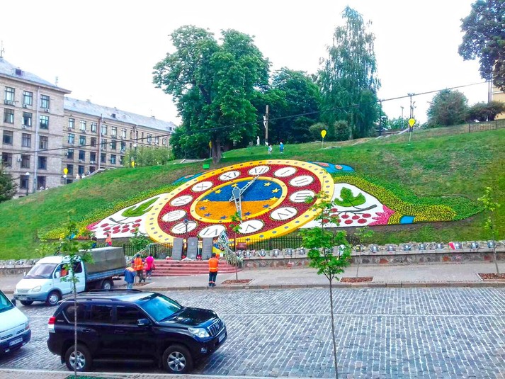 «Квіткове панно площею понад 300 квадратних метрів присвячено національним символам України: гілки калини з бегонії та альтернантери, жовто-блакитна стрічка з агератуму та колеусу, квітка з тагетісу та рожевої бегонії; циферблат - монопосадка яскраво-червоної бегонії та стилізовані зірки Євросоюзу на синьо-жовтому тлі з декоративної мульчі. Загалом висаджено близько 20 000 одиниць квіткової розсади», - повідомили «зеленбудівці».