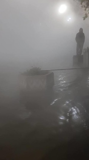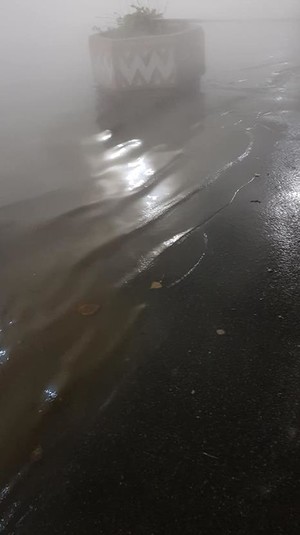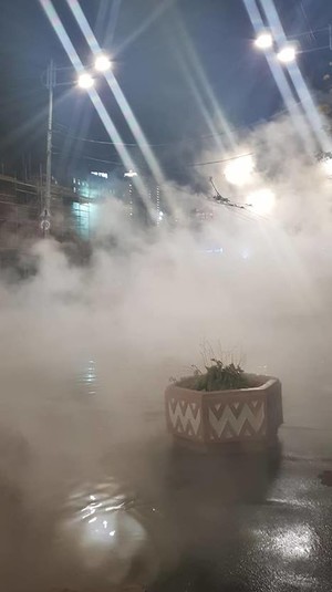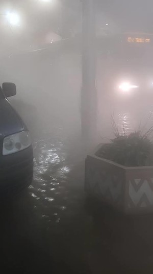 Гаряча вода залила вулицю. Автомобілі та громадський транспорт їдуть через потоки води на дорозі.