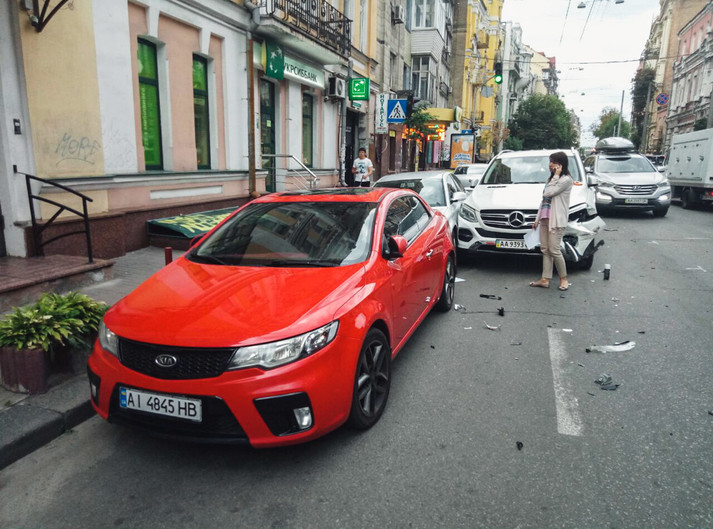 Volkswagen Golf III рухався по вулиці Стрілецькій і повертав на вулицю Велика Житомирська на заборонний сигнал світлофора. З боку вулиці Михайлівської рухався Mercedes GLE 250. Не встигнувши загальмувати, він вдарив Golf в праву сторону. Від удару хетчбек відкинуло на зустрічну смугу, де рухався Volkswagen Passat B7. Mercedes, в свою чергу, відкинуло на узбіччя, на якій був припаркований Volkswagen Passat B5. Останній від удару зрушився вперед і вдарив Kia Cerato Coup, що стояв попереду.