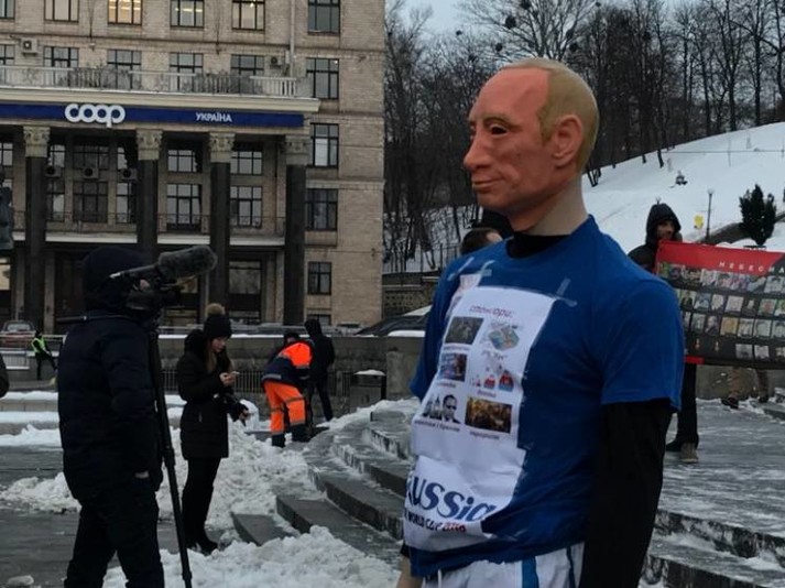 Так, у Києві зібралися кілька десятків людей, які били пенальті манекену у вигляді Путіна, який стояв на Майдані.