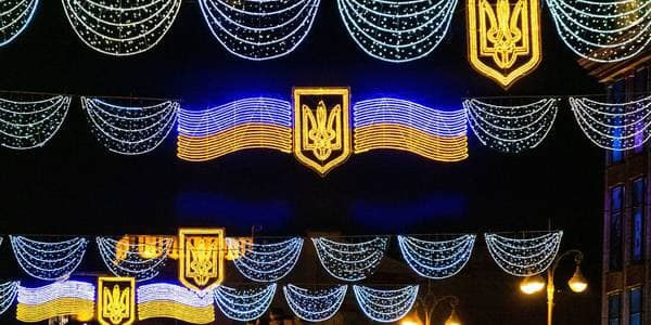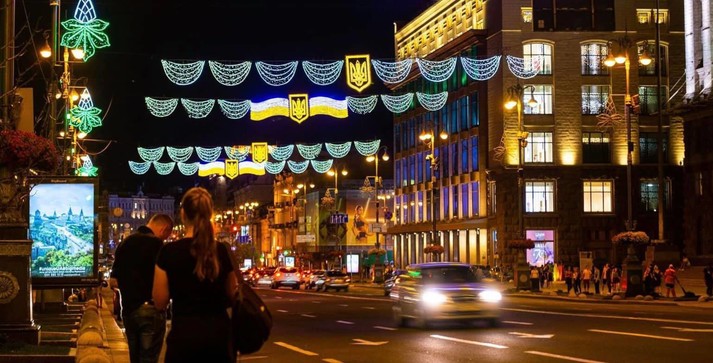 Так, вулицю Хрещатик прикрасила ілюмінація на тросових розтяжках над проїжджою частиною (21 білий тризубець і жовто-синій прапор) та на опорах зовнішнього освітлення (70 «каштанів»).