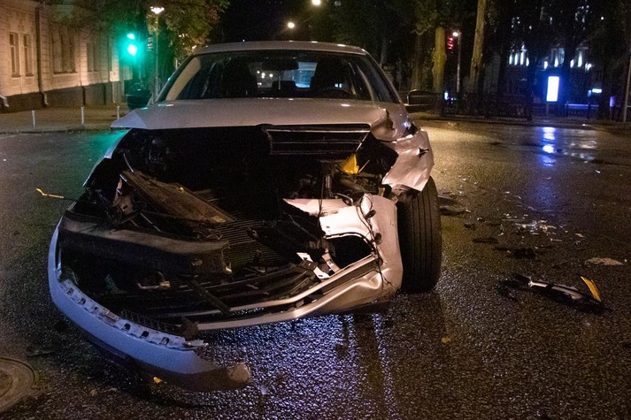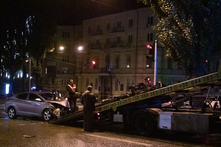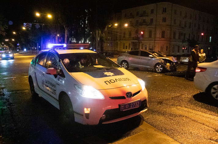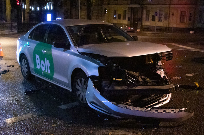 У ніч на вівторок, 1 жовтня, на бульварі Шевченка в центрі Києва сталася ДТП за участю двох автомобілів: на перехресті з вулицею Терещенківською зіткнулися Hyundai і автомобіль служби таксі Bolt.