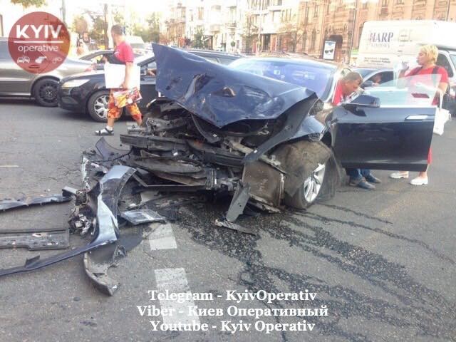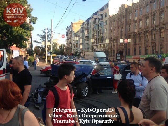 За попередньою інформацією, автомобіль Range Rover пересувався по вулиці Льва Толстого, а Tesla - по вулиці Саксаганського. На перетині вулиць машини зіткнулися. Від удару позашляховик відкинуло на пішохідну зону, де в цей момент були пішоходи. Після чого Range Rover врізався ще один автомобіль, який за інерцією зачепив наступну машину.