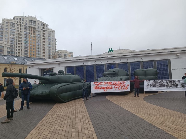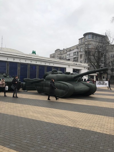 У четвер, 16 грудня, біля станції метро «Арсенальна» з'явилися надувні танки. Про це повідомляють журналісти у Facebook.