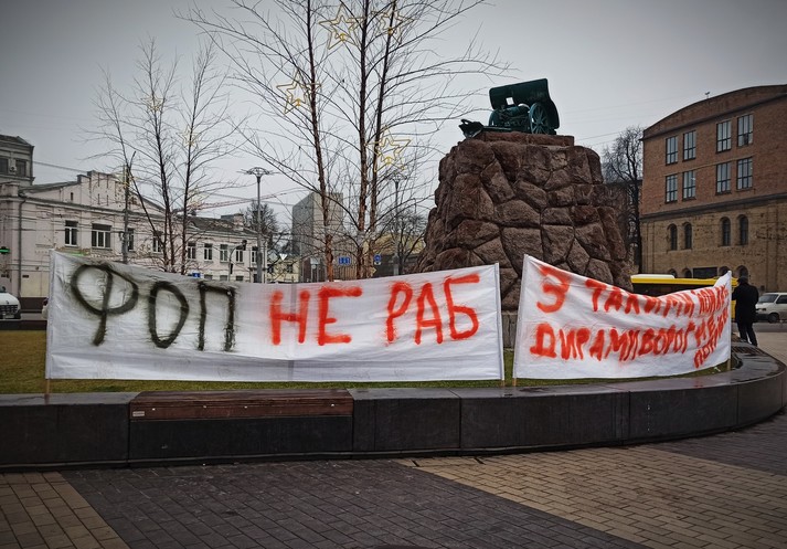 Поруч із надувними танками чоловіки тримають плакат із написами «Я надув танки, а військові надули мене», «Держава обкрадає ФОПів».