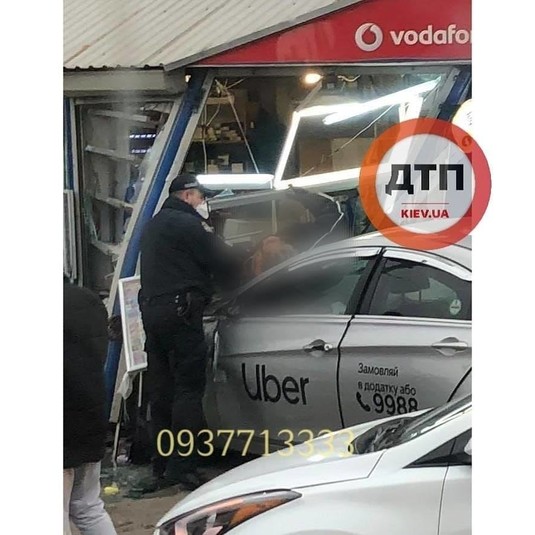 Попередньо, в результаті ДТП між двома автомобілями Hyundai водій автомобіля служби таксі Uber вилетів на тротуар і в'їхав в кіоск.