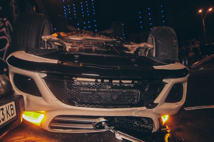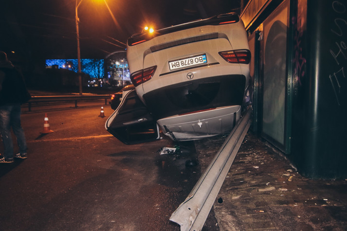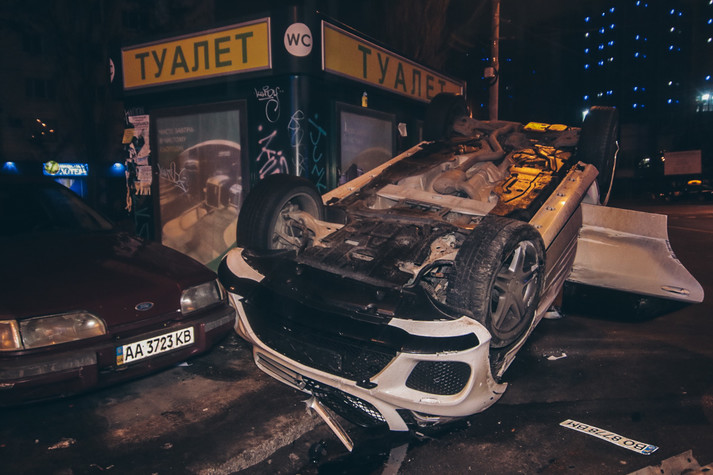 Водій Mercedes розповів, що він рухався по вулиці Велика Васильківська. Несподівано перед ним Lanos змінив напрямок і пішов на розворот в бік ТРЦ Ocean Plaza. Хлопець не встиг зреагувати, вилетів на бордюр, перекинувся і зупинився об стіну громадського туалету.