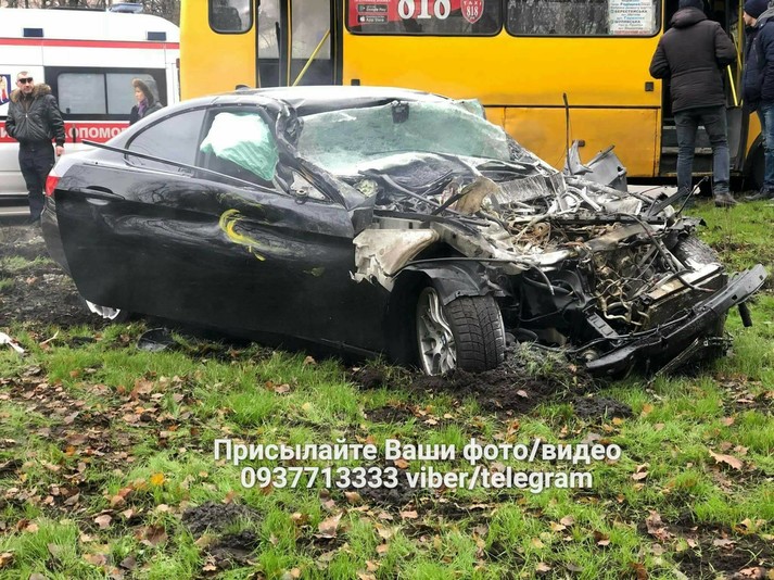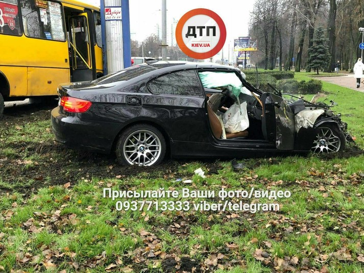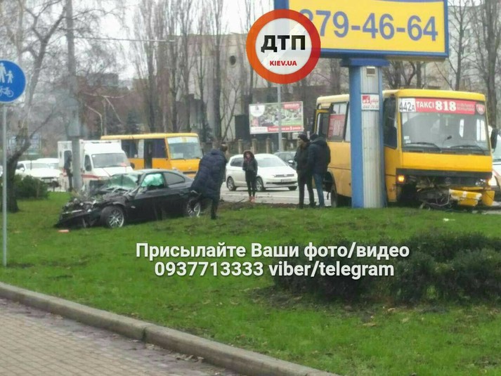 За його даними, водій автомобіля BMW, рухаючись на високій швидкості, врізався в маршрутку, яку від удару жбурнуло на опору рекламної конструкції. BMW виїхав на газон. Серйозно постраждав пасажир BMW.