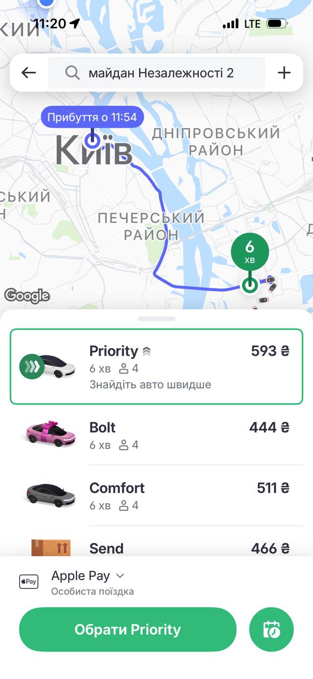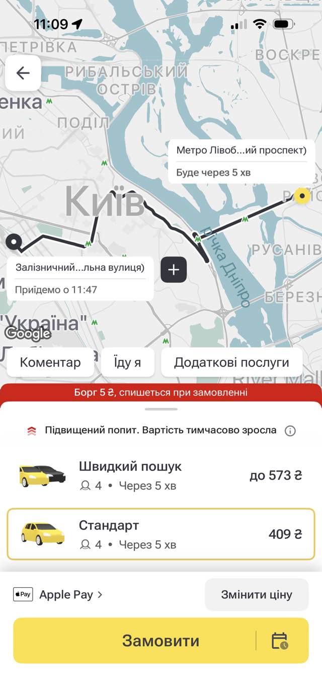 Від метро «Лівобережна» до Центрального залізничного вокзалу: мінімальна вартість складає 409 грн, тоді як за прискорену подачу машини доведеться заплатити 573 грн.
