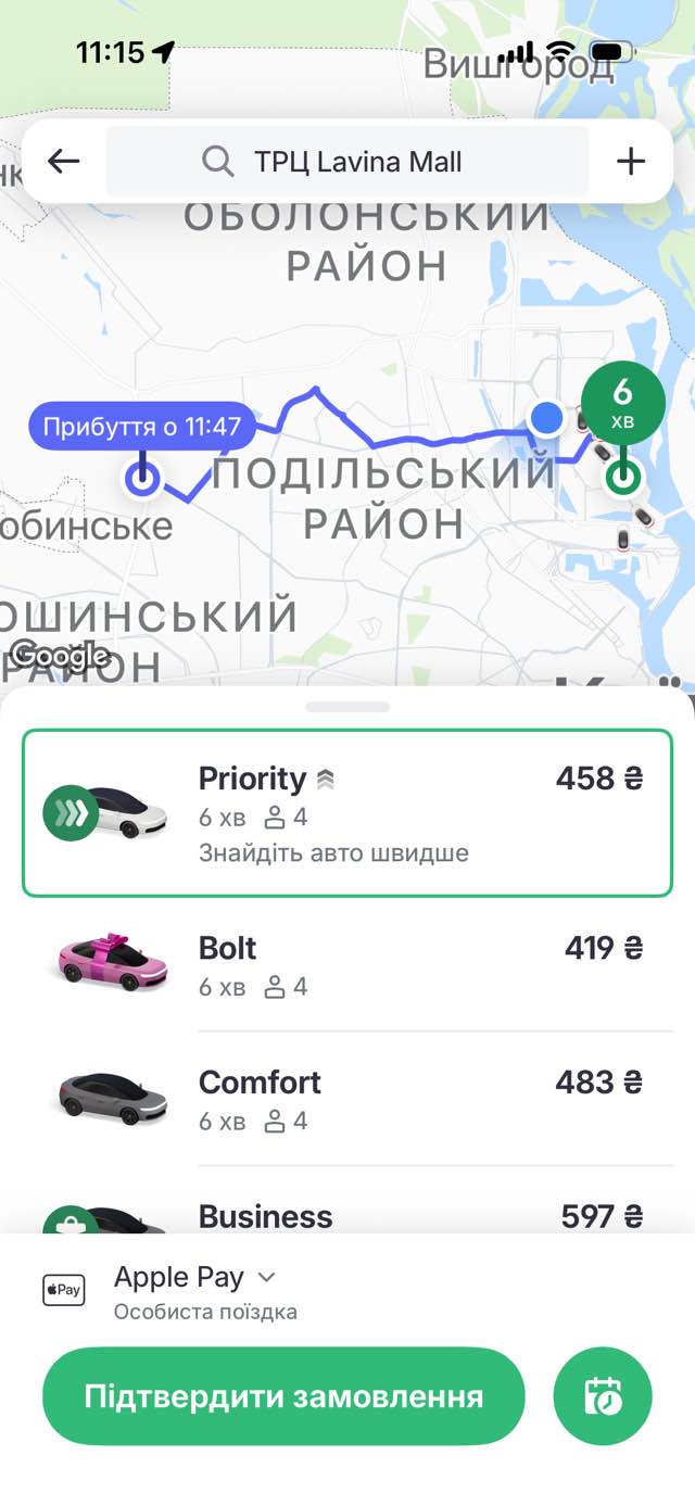 Поїздка від просп. Володимира Івасюка (Оболонь) до ТРЦ Lavina Mall обійдеться мінімум у 419 грн.