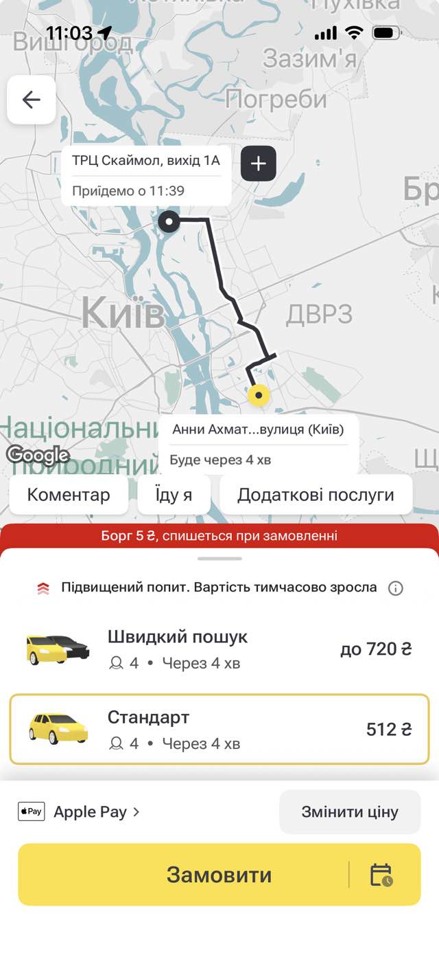 Від вулиці Анни Ахматової (Позняки) до ТРЦ Sky Mall вартість становить 512 грн, тоді як сервіс прискореного пошуку машини пропонує тариф у 720 грн.
