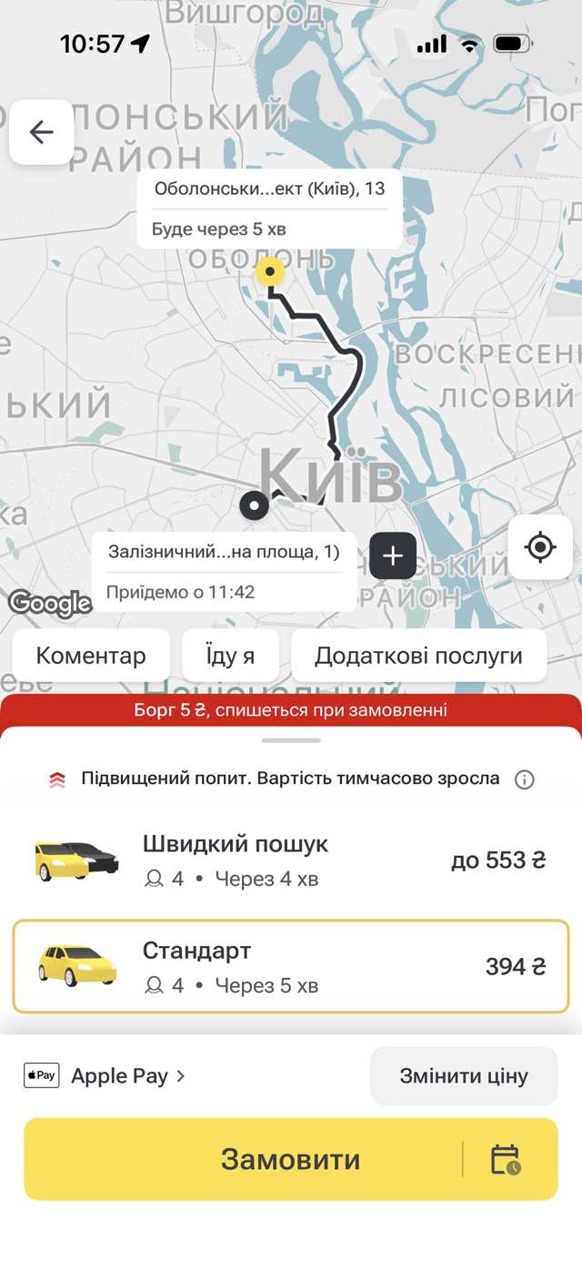 Зокрема, поїздка з Оболоні до Центрального залізничного вокзалу наразі обійдеться у 394 грн. При використанні сервісу «швидкий пошук авто» ціна зростає до 553 грн.