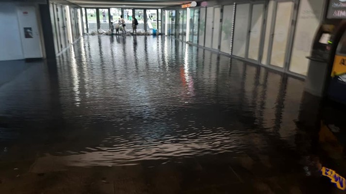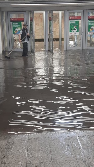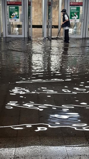 Працівники метро і ТЦ намагаються прибрати воду швабрами і прибиральними машинами