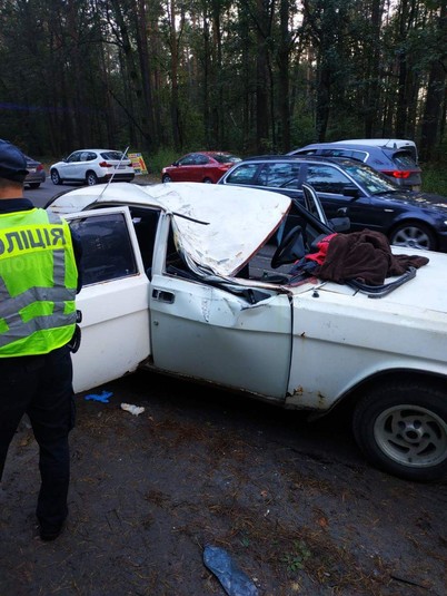 На проїжджій частині дороги на автомобілі Volkswagen та ГАЗ «Волга» внаслідок пориву вітру впало дерево. У «Волзі» затиснуло водія та пасажира.
