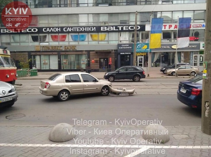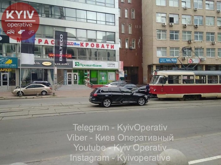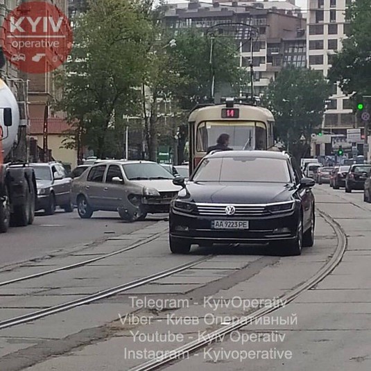 Сьогодні, 11 липня, близько 9:30 на вулиці Глибочицькій у Шевченківському районі Києва сталася ДТП: на трамвайних коліях зіткнулися автомобілі Volkswagen та Renault.