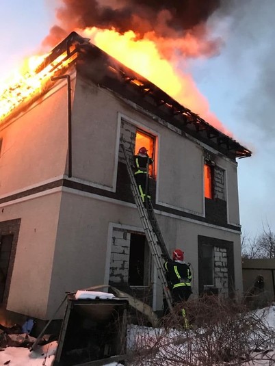 На місці рятувальники встановили, що загоряння сталося на другому поверсі недобудованого будинку з розповсюдженням на дах.