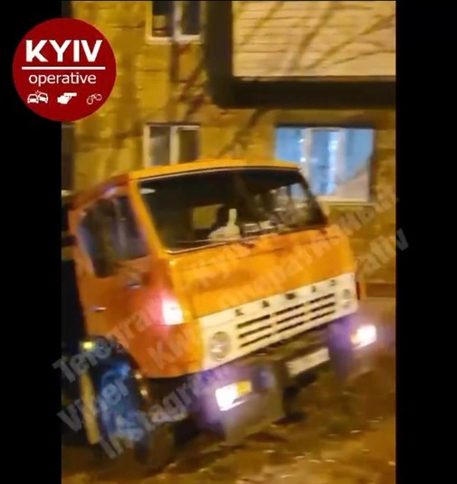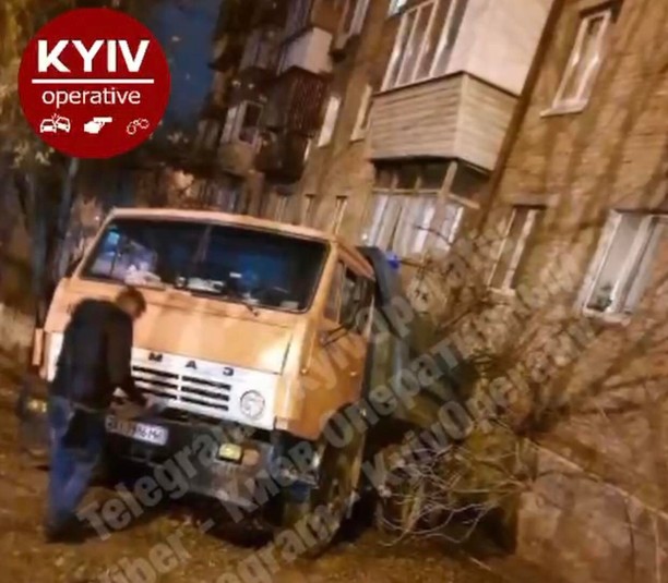 У Києві КамАЗ без водія зім’яв легковик і врізався в будинок (фото, відео)