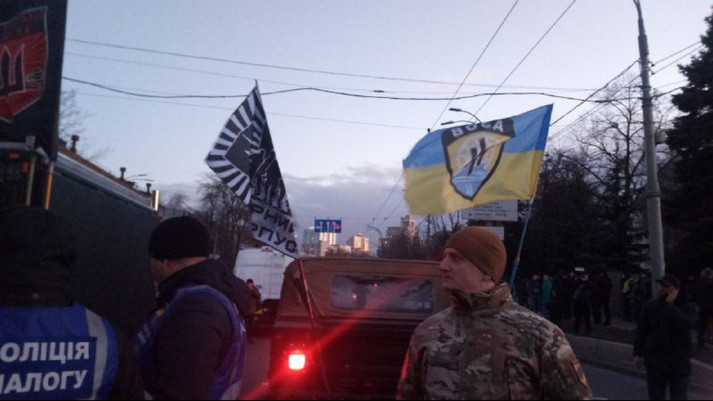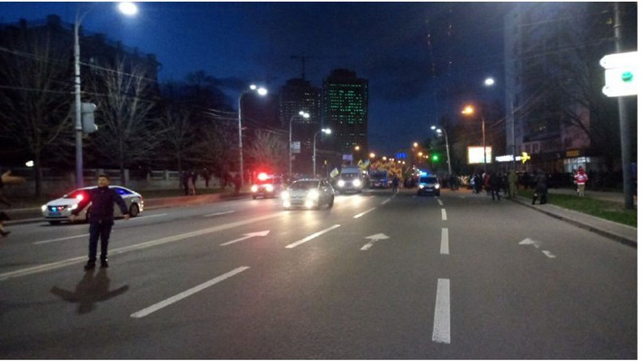За правопорядком стежить Нацполіція, патрульні. Люди обурюються, що дорогу перекрили. Хода ще має рушити до посольства Росії.