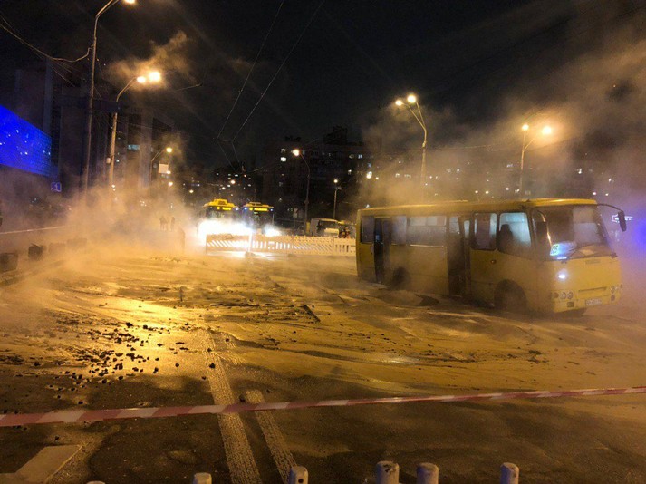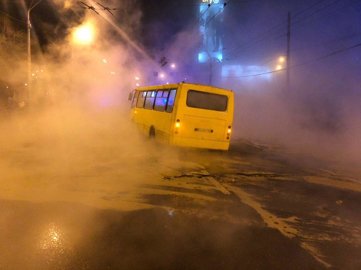 У Києві на вулиці Антоновича маршрутний автобус з пасажирами провалився в яму з окропом.