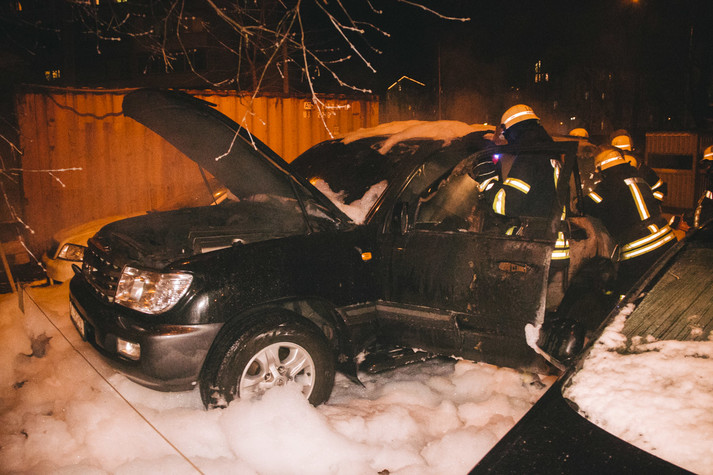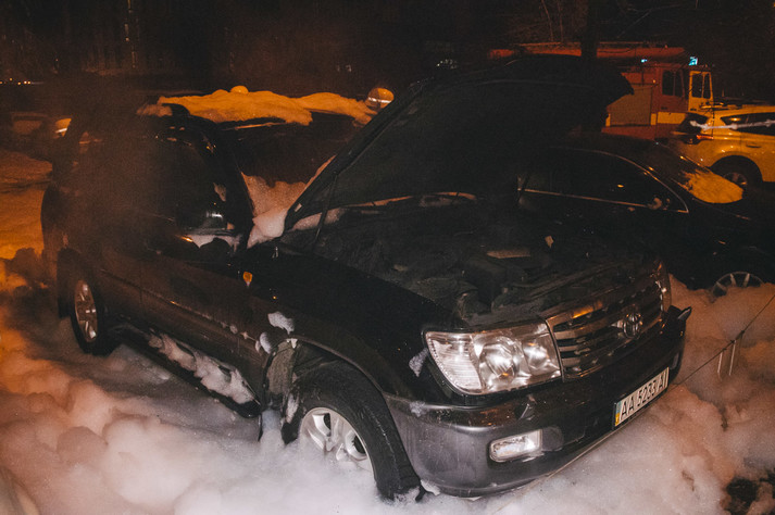 У четвер, 7 лютого, на проспекті Соборності, 13 у Києві горів позашляховик. Автомобіль Toyota Land Cruiser підпалили двоє чоловіків, які закинули в салон ємність з горючою речовиною і зникли з місця події.