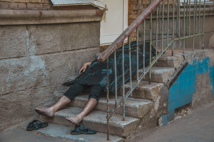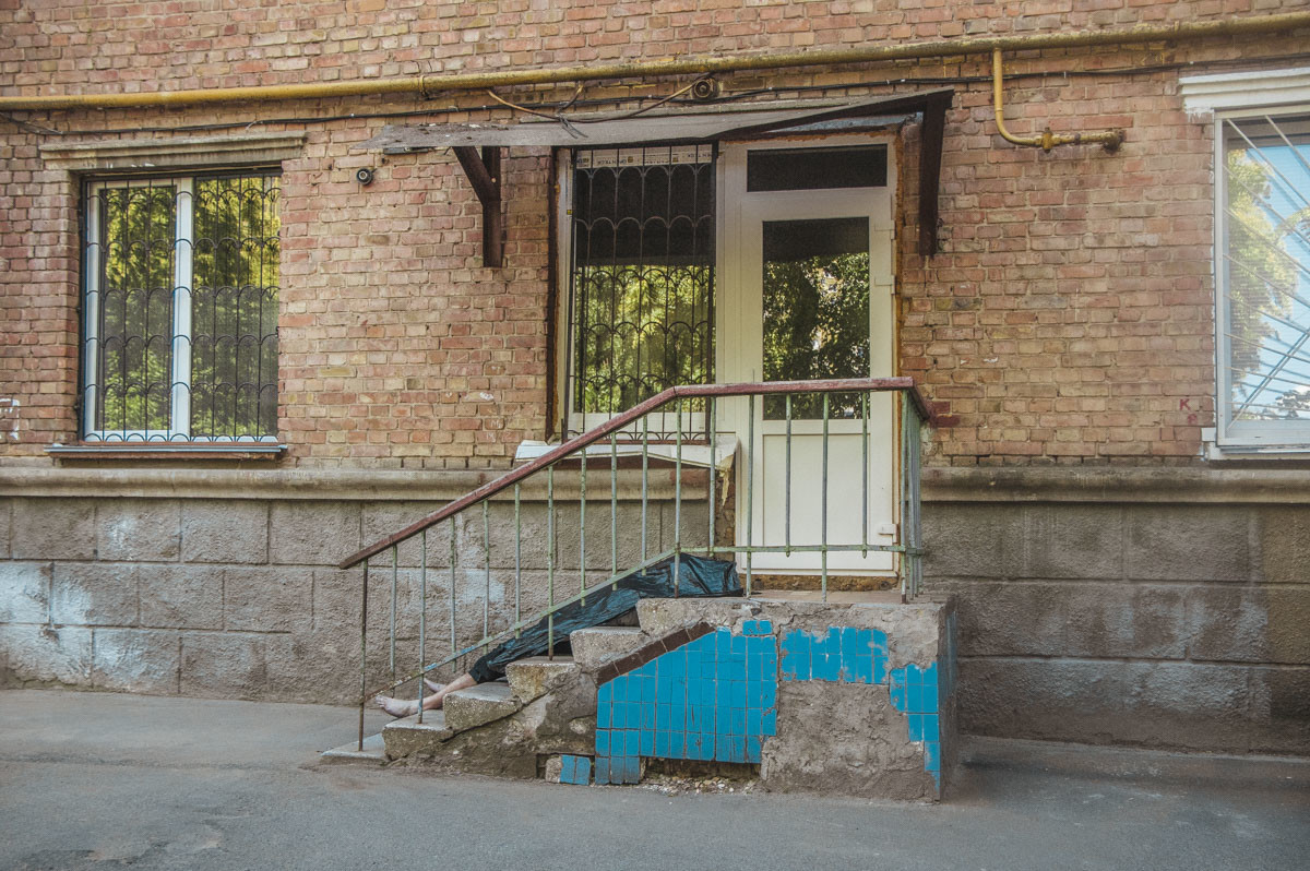 Чоловік лежав на сходах, що ведуть в хостел