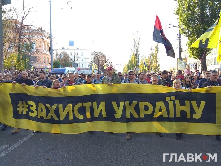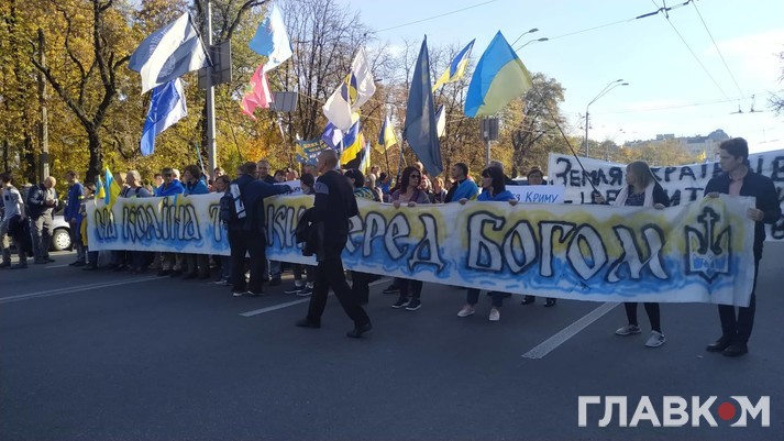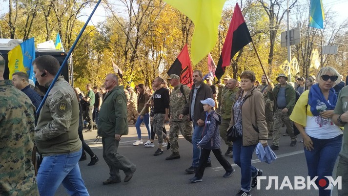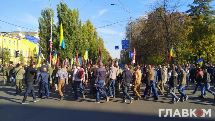 Зокрема, колони націоналістів та добровольців рушили від бульвару Шевченка, далі йтимуть Хрещатиком до вулиці Інститутської, а потім алеєю Героїв Небесної сотні пройдуть до Банкової.