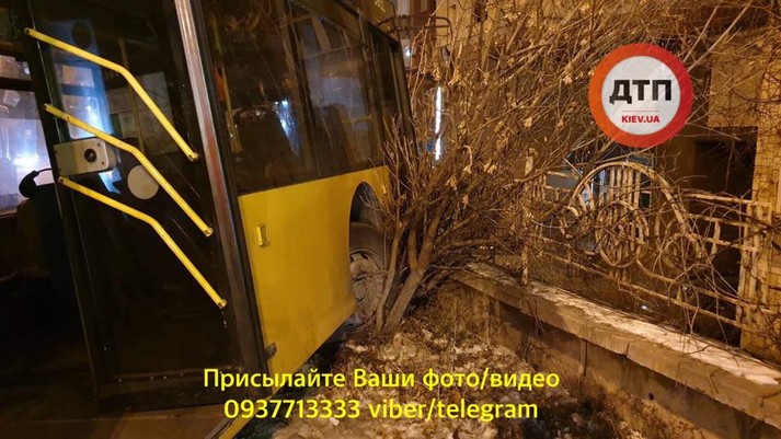 Як повідомляє dtp.kiev.ua, тролейбус став некерований і вилетів на тротуар, де врізався в огорожу і дерево.