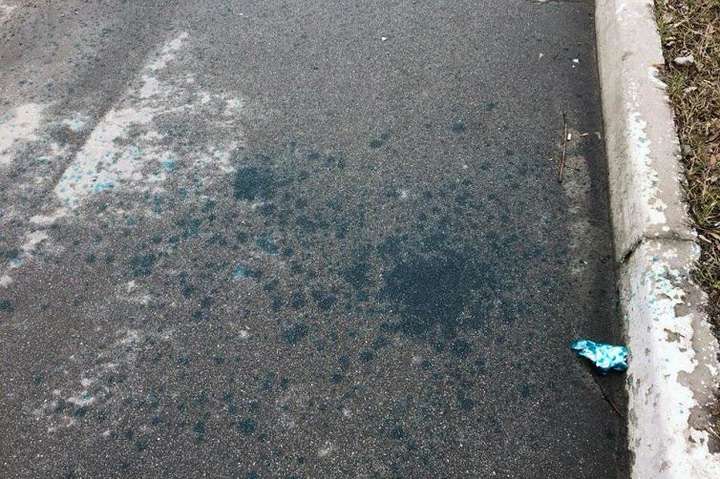 На місці події потерпілий розповів, що, коли він виходив із автомобіля, до нього підійшов невідомий у капюшоні, бризнув зеленкою і втік.